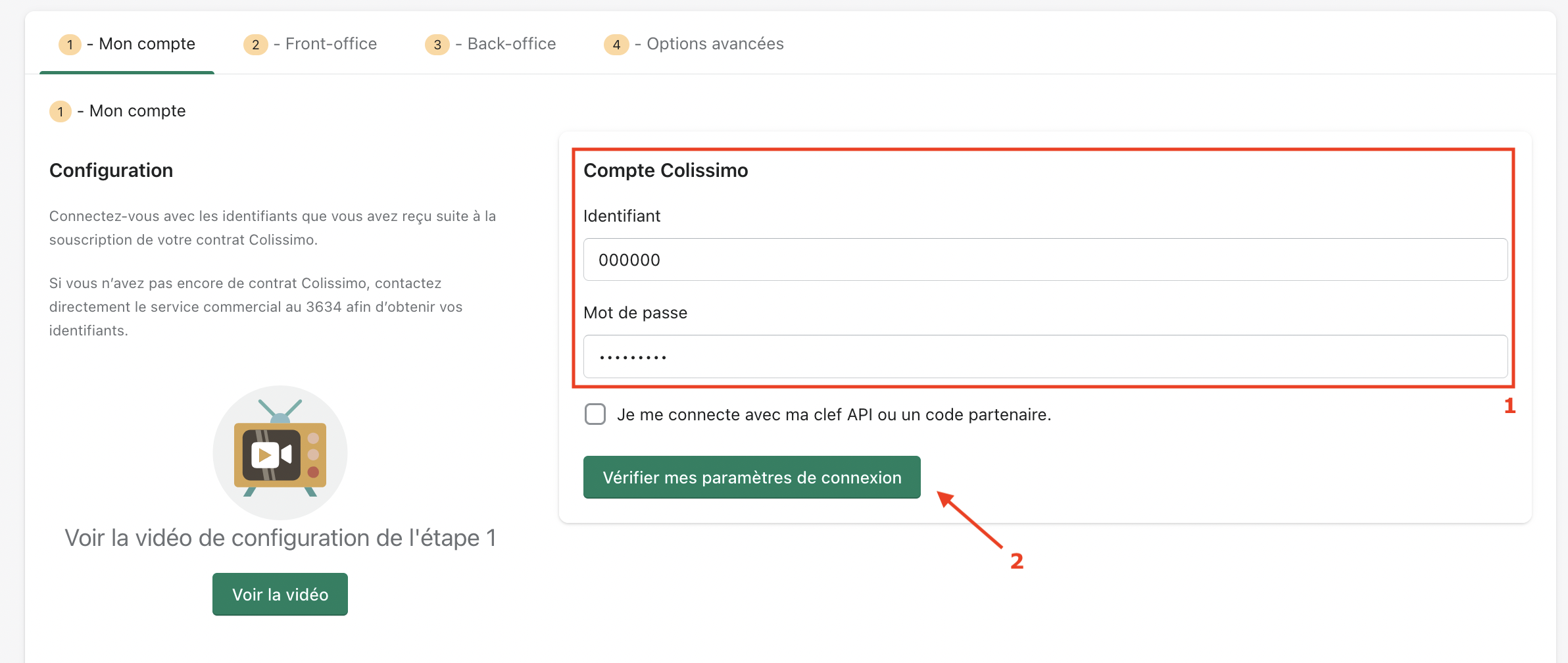 Vous pouvez utiliser le bouton sous le formulaire (2) pour vérifier que vos informations de connection sont correctes. Un message apparaitra en bas de l'écran et indiquera si vous êtes bien connectés ou si vos identifiants sont incorrects.