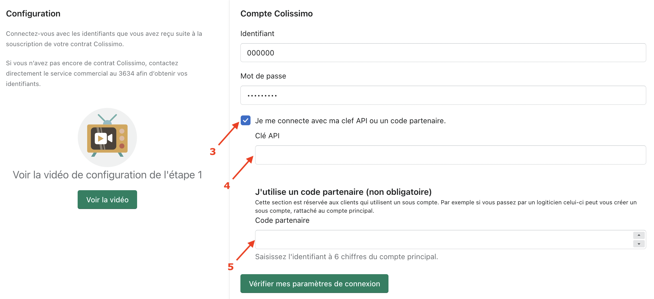 Il est possible de vous connecter via une clé API ou un compte partenaire. Pour cela il faut cocher la case "Je me connecte avec une clé API ou un code partenaire" (3). Vous devrez alors renseigner votre clé API (4) et si vous voulez utiliser un sous compte il faudra saisir le code partenaire (5).