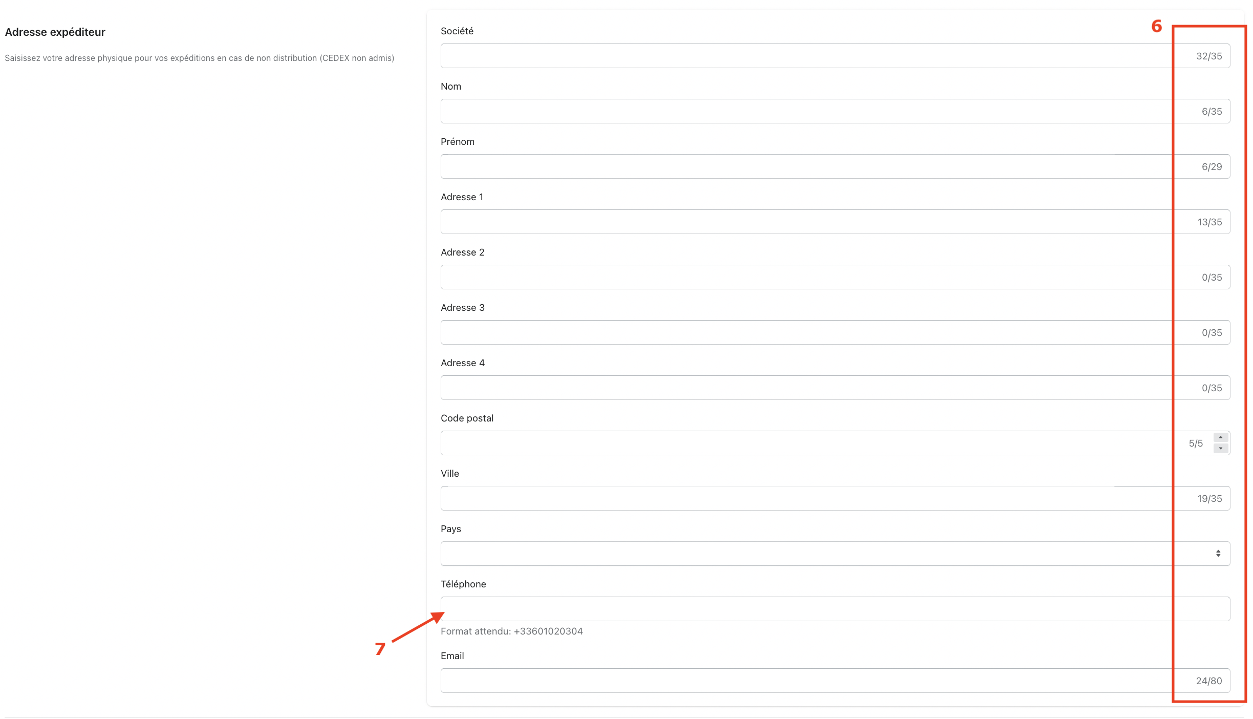 Pour le champ téléphone (7) l'indicatif téléphonique est doit être inclus dans le numéro, par exemple +33601020304. Ce numéro de téléphone apparaitra sur vos étiquettes, il est nécessaire pour vous joindre en cas de refus de livraison du colis par le destinataire.