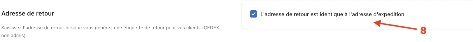Vous avez la possibilité d'utiliser la même adresse de retour que votre adresse d'expéditeur si vous voulez que vos colis reviennent de l'endroit où ils sont partis.Pour cela vous avez juste à cocher la petite case : "L'adresse de retour est identique à l'adresse d'expédition" (8).