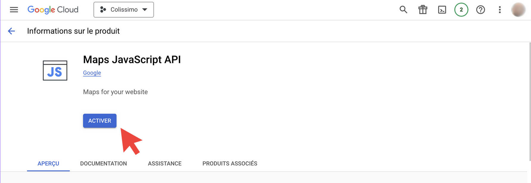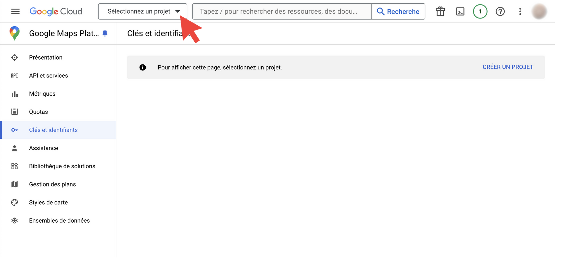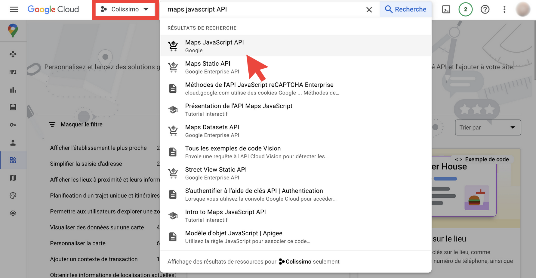 Après avoir cliqué sur “CRÉER”, vérifiez que vous êtes bien dans le bon projet en haut à gauche, puis effectuez une recherche de ressource dans la barre en haut de la page en tapant le mot “maps JavaScript API”. Sélectionnez la ligne correspondante.