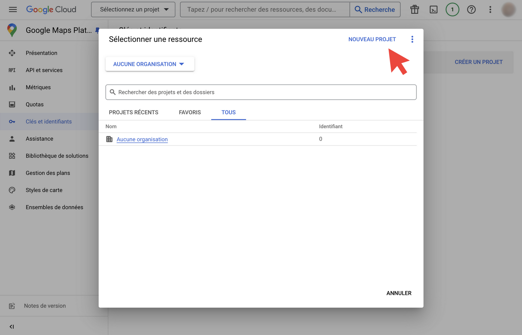Choisissez votre organisation ou cliquez sur “NOUVEAU PROJET”