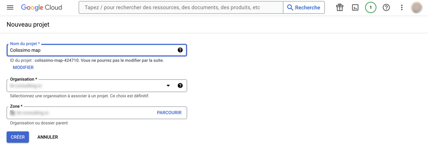 Renseignez le nom du projet et sélectionnez l’organisation