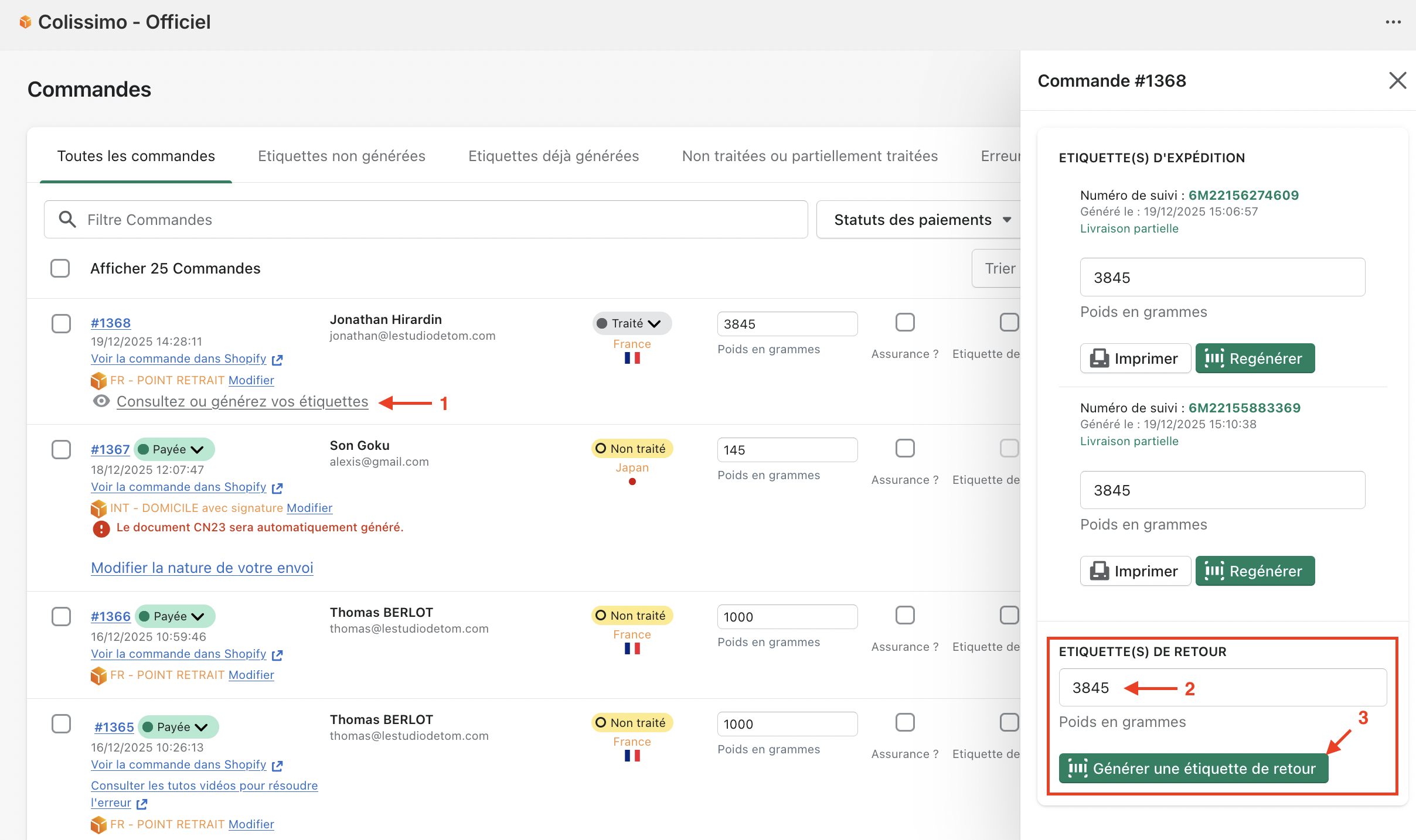 - Cliquez sur "Générer une étiquette de retour" (3).