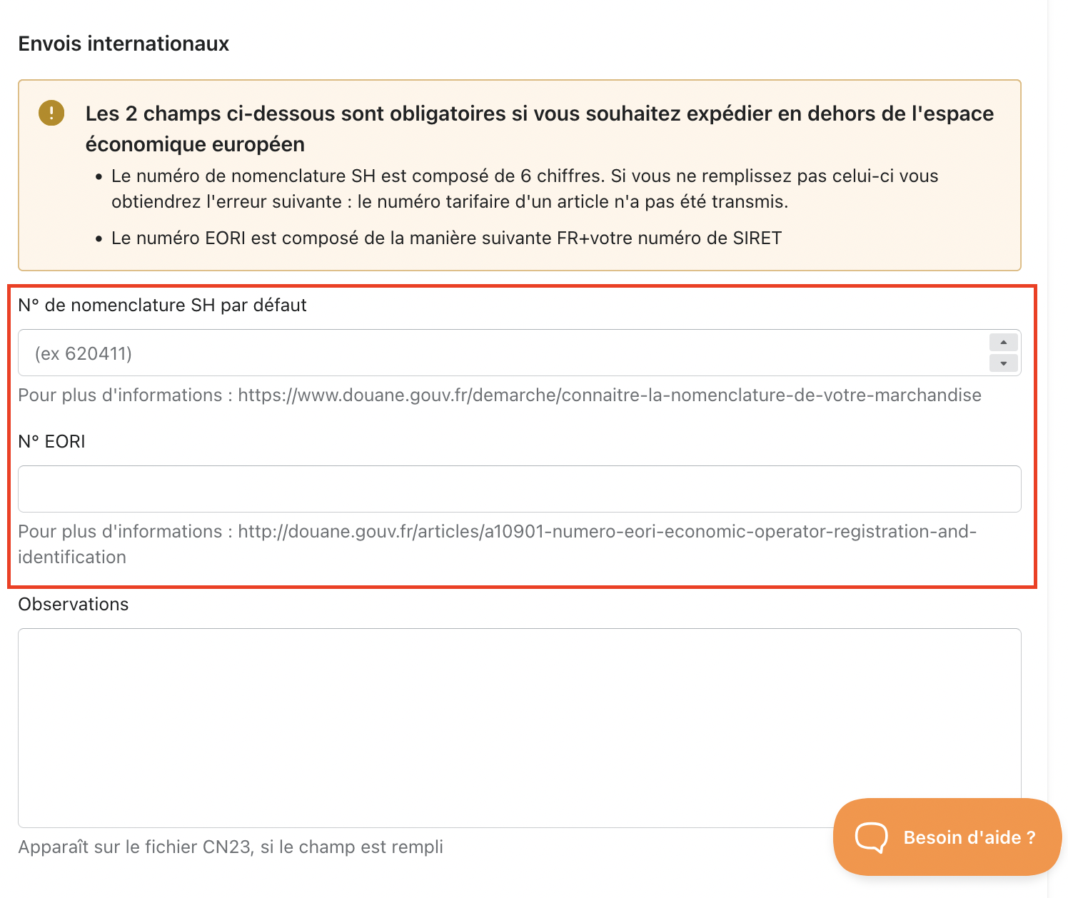 Pour pouvoir générer une étiquette d'expédition, ainsi que le CN23 associé, vous devez avoir renseigné, dans la configuration 3 - Back-Office de l'application, les champs N° de nomenclature SH et N° EORI de la partie Expéditions internationales.