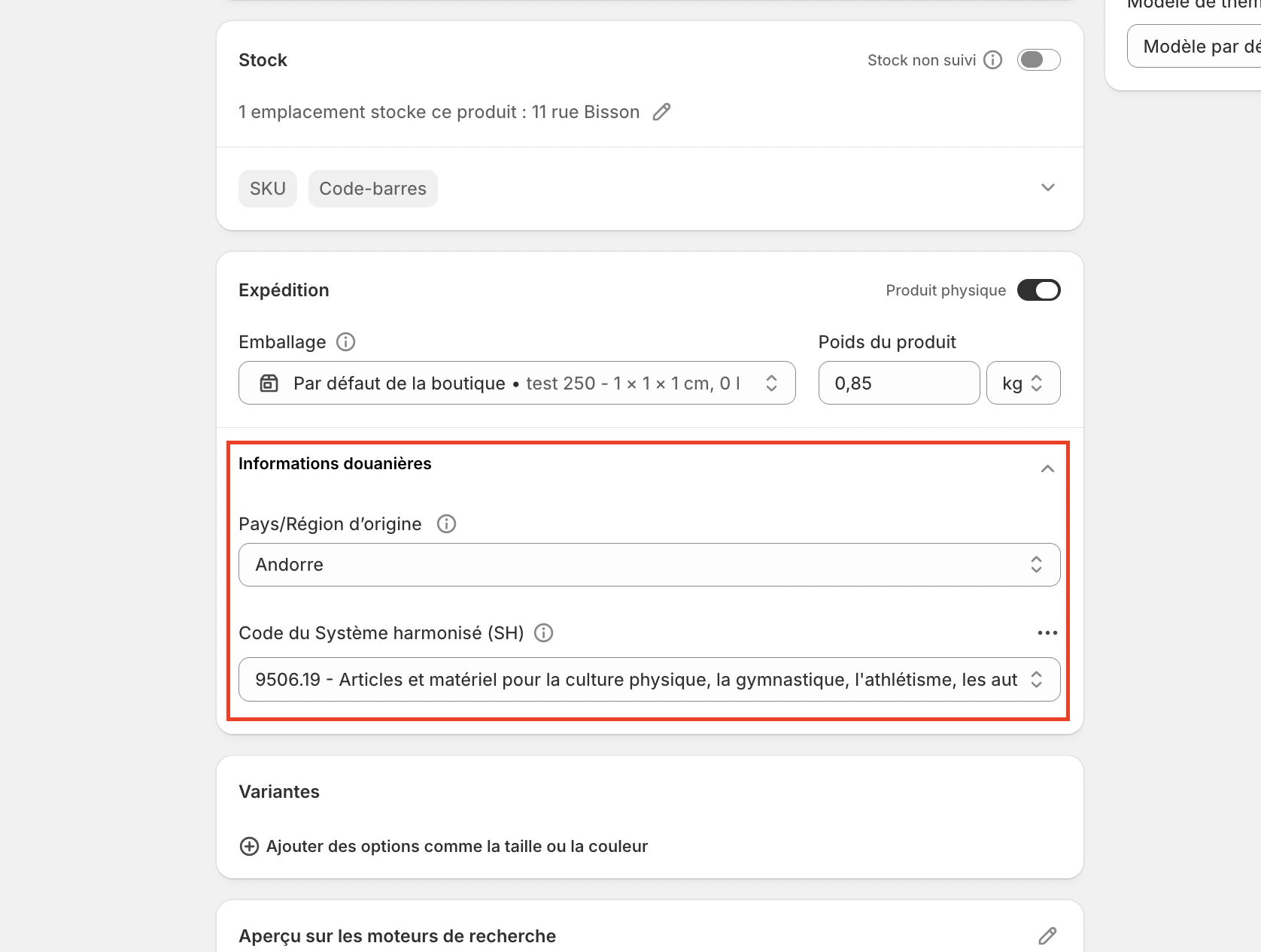 Si vous vendez différents types de produits, il est recommandé de renseigner ce numéro SH dans chacune de vos fiches produit dans la partie Expédition :