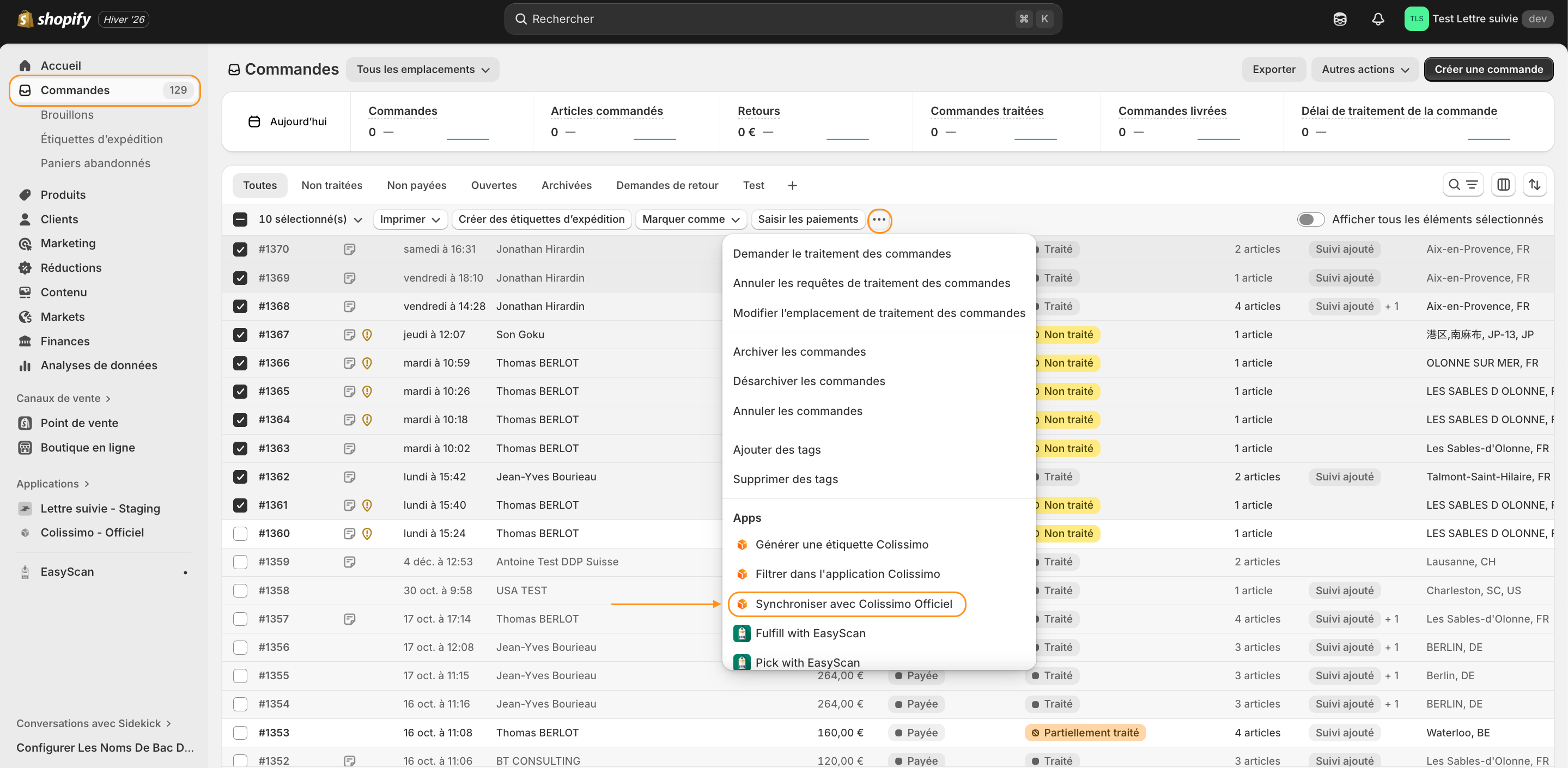 Pour ce faire, vous devez vous rendre dans la vue Commandes de Shopify, de cocher les commandes concernées et de venir cliquer sur les trois petits points, pour ensuite synchroniser les commandes avec l'application.