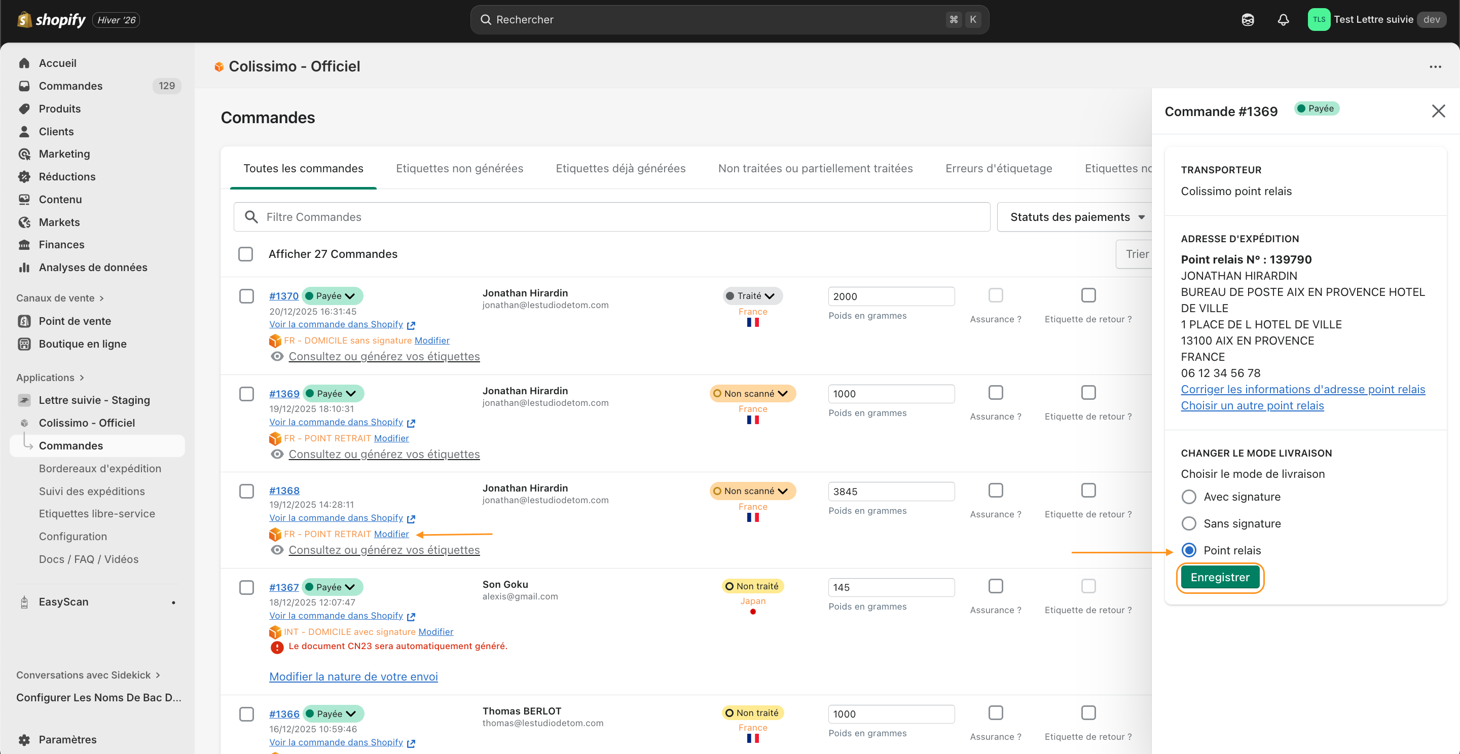 Pour cela, vous devrez cliquer sur Modifier, un volet va s'ouvrir sur votre droite et vous pourrez affecter un mode de livraison. ensuite il faudra cliquer sur enregistrer et la map des points relais va s'ouvrir, sur laquelle vous pourrez choisir le point relais a affecter à la commande.